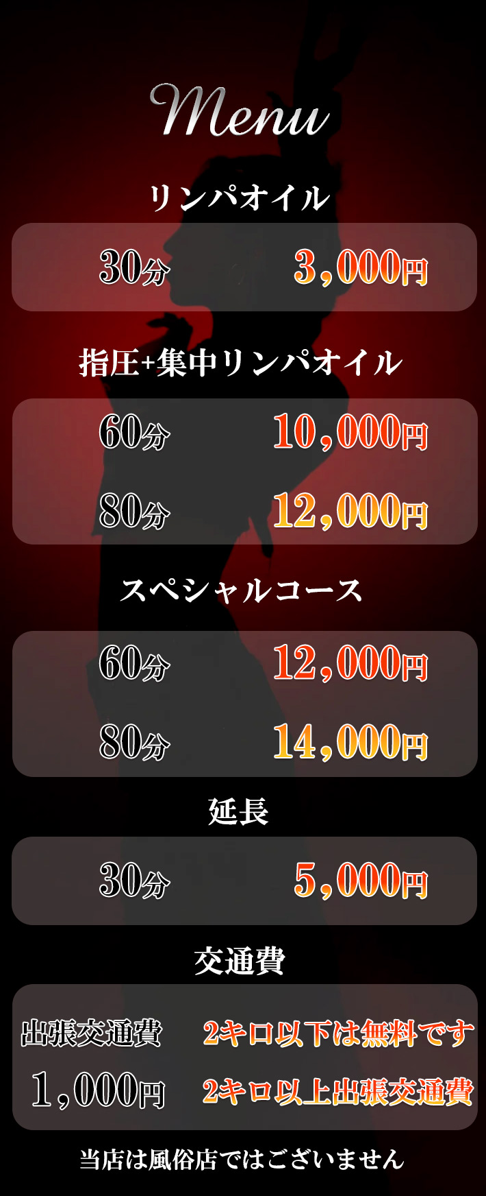 当店では、アロマオイルの効能と当店自慢のセラピストによるリンパマッサージの相乗効果による、癒しのひとときをお客様お一人お一人にお届けしております、自然で心やすらぐ優美な香りを、施術中はもちろんご帰宅お休みになってから翌日朝目覚めでまで楽しんで頂けます、どうぞゆっくりご堪能ください。